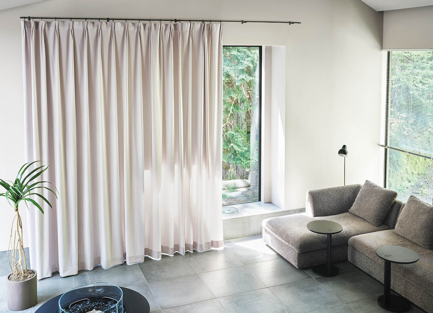 • 質感の魔法: 上質なヨーロッパ産リネンを使用しており、光を優しく透かす表情が絶妙です 。大開口の窓に吊るすことで、強い日差しを「柔らかな木漏れ日」へと変え、無垢材のフローリングや石壁の質感をより一層引き立てます 。