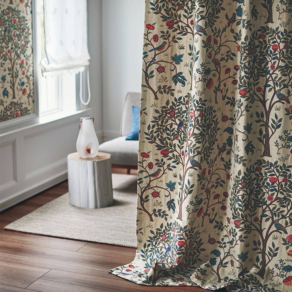 - おすすめの理由: まるで手刺繍のようなふっくらとした糸のボリューム感。 鳥たちが集う木々の枝葉には、計算された「影」が織り込まれています。そのため、平面の布であるはずなのに、光が当たると葉が浮き上がってくるような錯覚を覚えます。 「量販店のカーテンとは、空気感が全く違う」とお褒めいただいた理由が、この圧倒的な密度にあります。