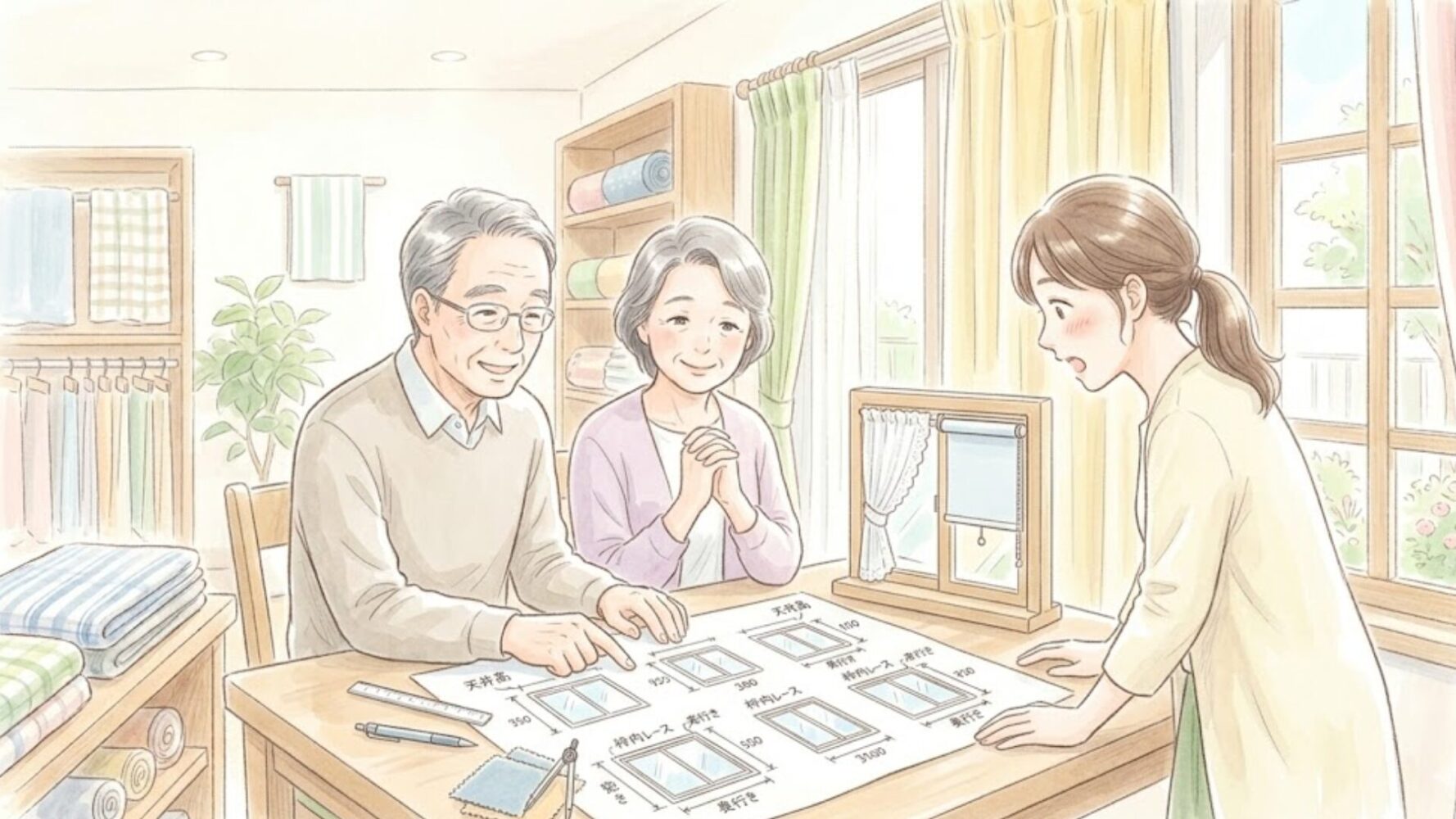 「光」と「影」を現地で合わせる: ショールームの照明と、お客様のお宅に差し込む西日の強さは違います。現場で生地を当ててみて初めて、「この長さなら眩しくない」「この透け感がベスト」という確信が持てます。